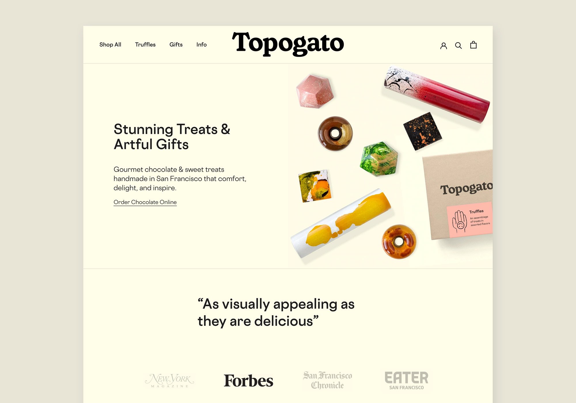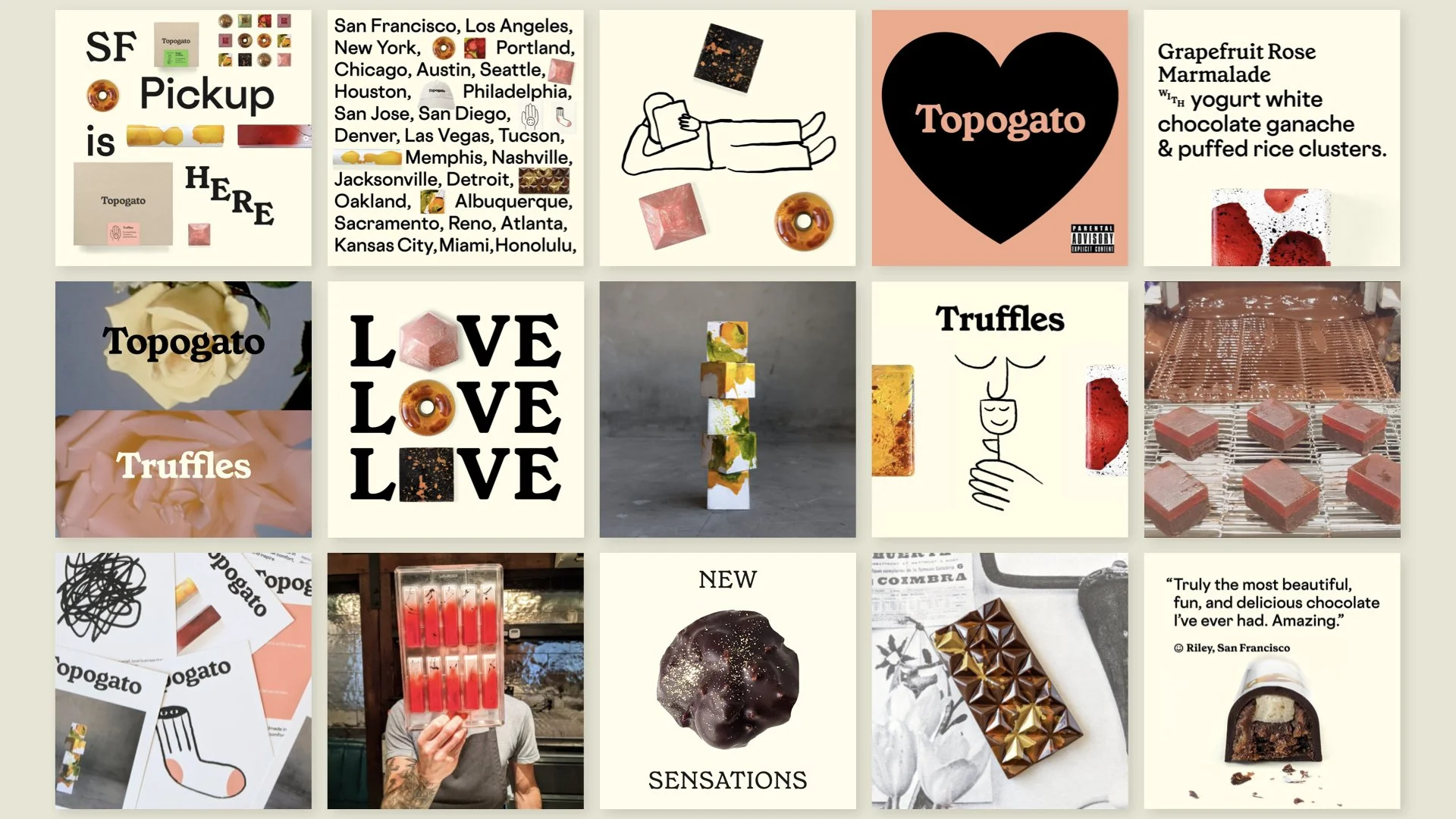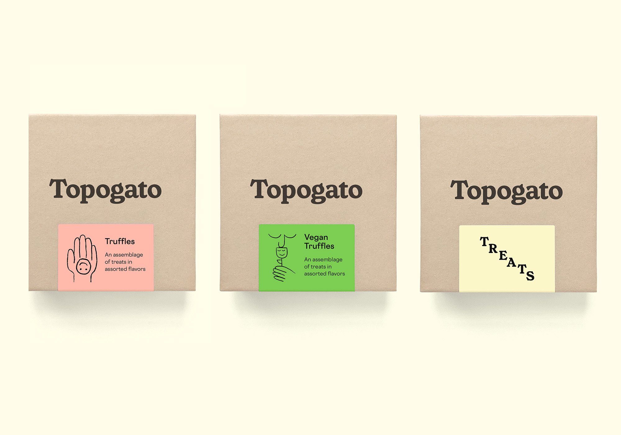 Topogato is an artisanal chocolate shop in San Francisco. We crafted everything from the brand strategy and name, to the complete brand identity system, e-commerce website, packaging and more.